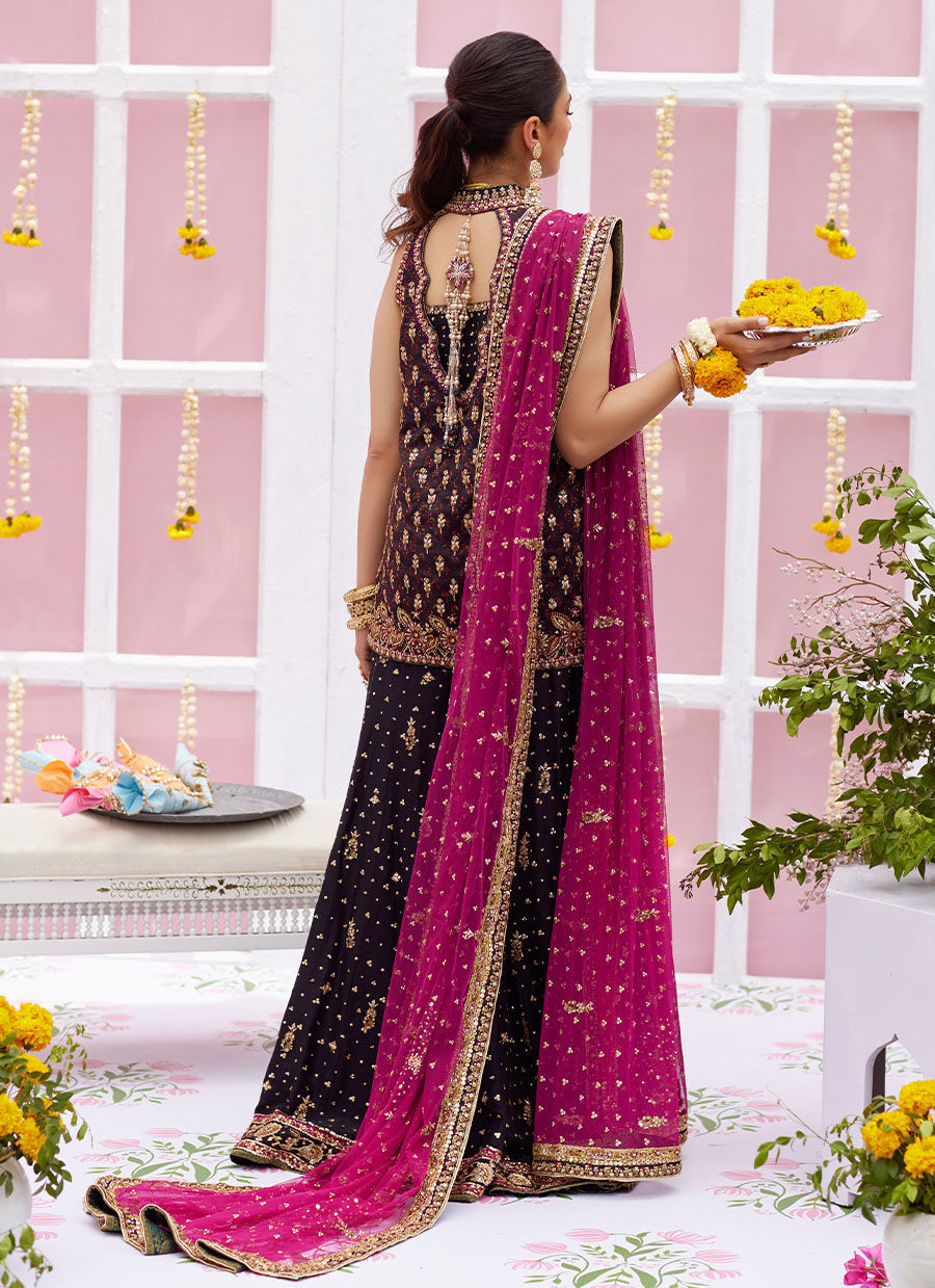 Color: Black Fabric: Shamoz Silk, Pure Raw Silk and Net Work Details: Embroidered and Embellished