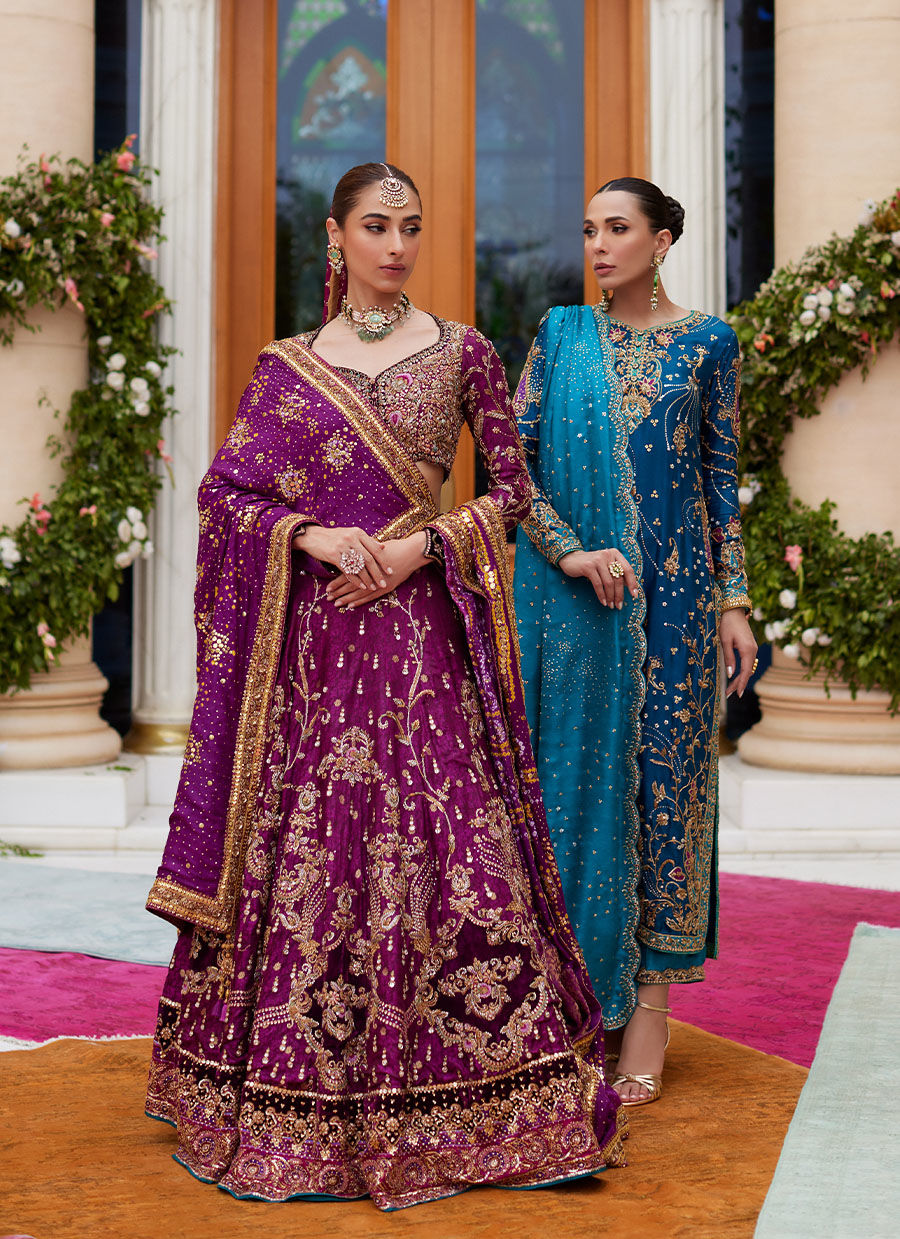 A deep, dark, romantic ensemble. Cut from pure exclusively woven banarsi silk, with an intricately hand embellished neckline and sleeves. Delicate jaal and hand work along with appliques adorn the shirt and sleeves. The irresistible combination of blues, gold and magenta with the occasional touch of silver is sure to make you stand apart from the crowd with effortless style. The accompanying izaar pant in a complementing blue hue is cut from pure silk jamawar as well and is finished with a hand worked applique border finishing off the ensemble with panache. The dupatta is cut from the same blue jamawar and is richly filled with sitara chan all over and a hand worked scallop border which completes the outfit (as shown).