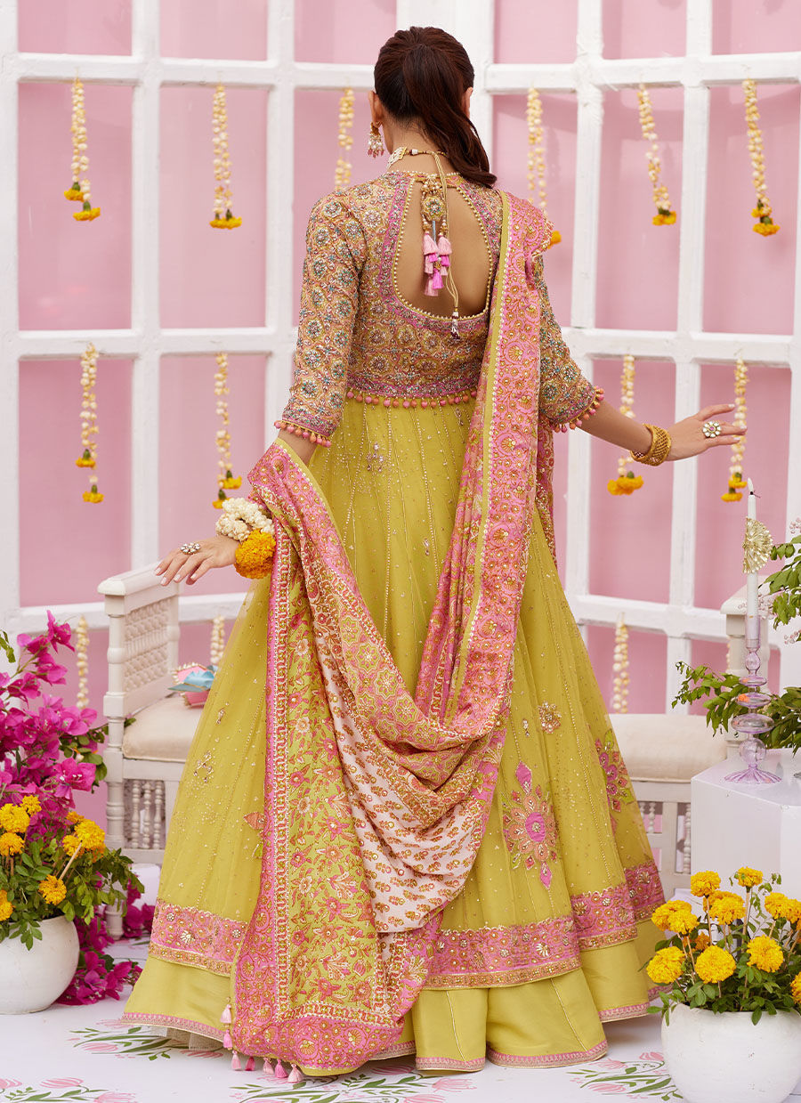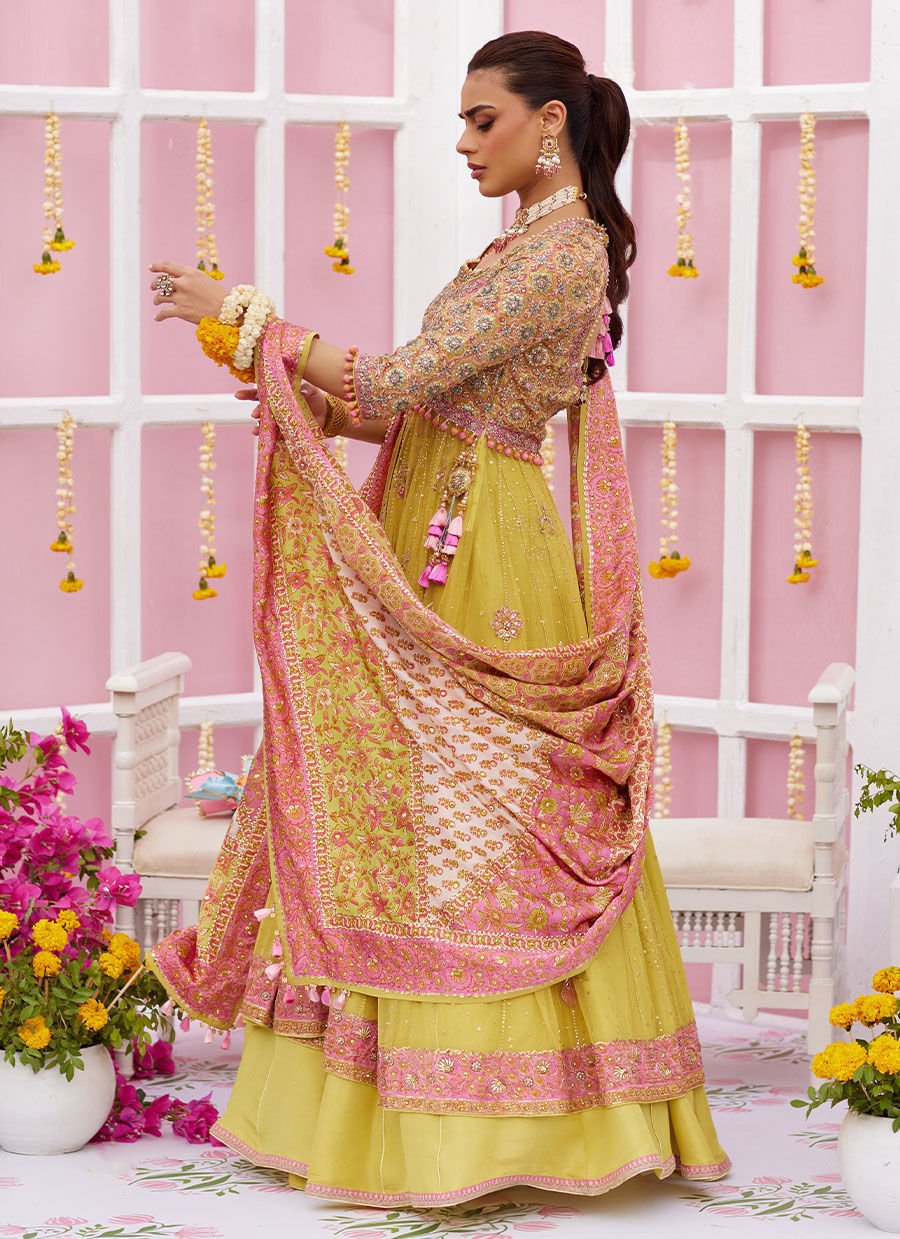 This exquisite ensemble features a vibrant kalidar in a refreshing kiwi hue, crafted from pure net. The blockprinted choli is adorned with intricate gota and resham handwork, adding a regal dimension to the bodice. The kalidar flares beautifully with appliqués in soft pink tones, enhanced by a blockprinted border that adds contrast and finesse. The look is completed with a zari fabric lehenga in matching kiwi, providing a rich foundation to the outfit. Paired with it is a stunning handworked dupatta in shades of pink and green on an ivory base, showcasing detailed blockprinting and elaborate embellishments. This design strikes the perfect balance between tradition and festivity, making it ideal for mehndi or daytime wedding events.
