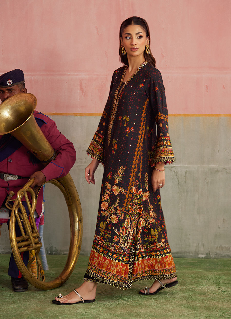 A contemporary take on classic elegance — this fluid crepe kaftan shirt in a striking ebony hue, offset with vibrant crimson and burnt orange, shimmers with hand embellished Swarovski crystals and resham detailing, for the slightest hint of tradition. Wear yours with our pure raw silk izaar for the perfect balance between ease and sophistication.