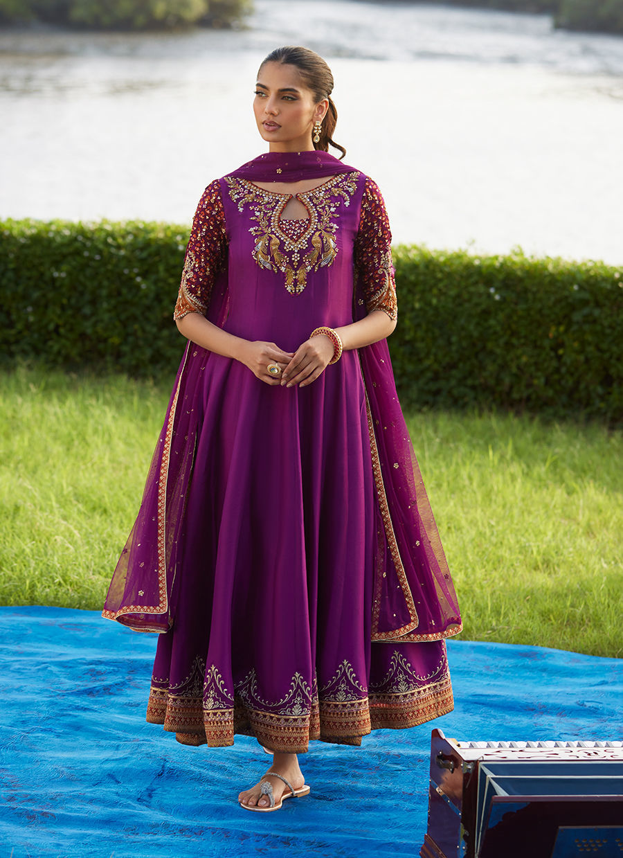 Radiating timeless elegance with a touch of festive flair, this deep amethyst raw silk ensemble is a masterclass in effortless glamour. The luminous jewel tone shimmers beautifully in motion, while the fluid drape of pure silk gives it an irresistibly luxe appeal. The meticulously hand-embroidered neckline and statement sleeves — adorned with classic gota, ari, zardozi, and pearl embellishments — reflect FTA’s signature craftsmanship. A vibrant tulle dupatta completes the look, adding a refreshing burst of color and sophistication.