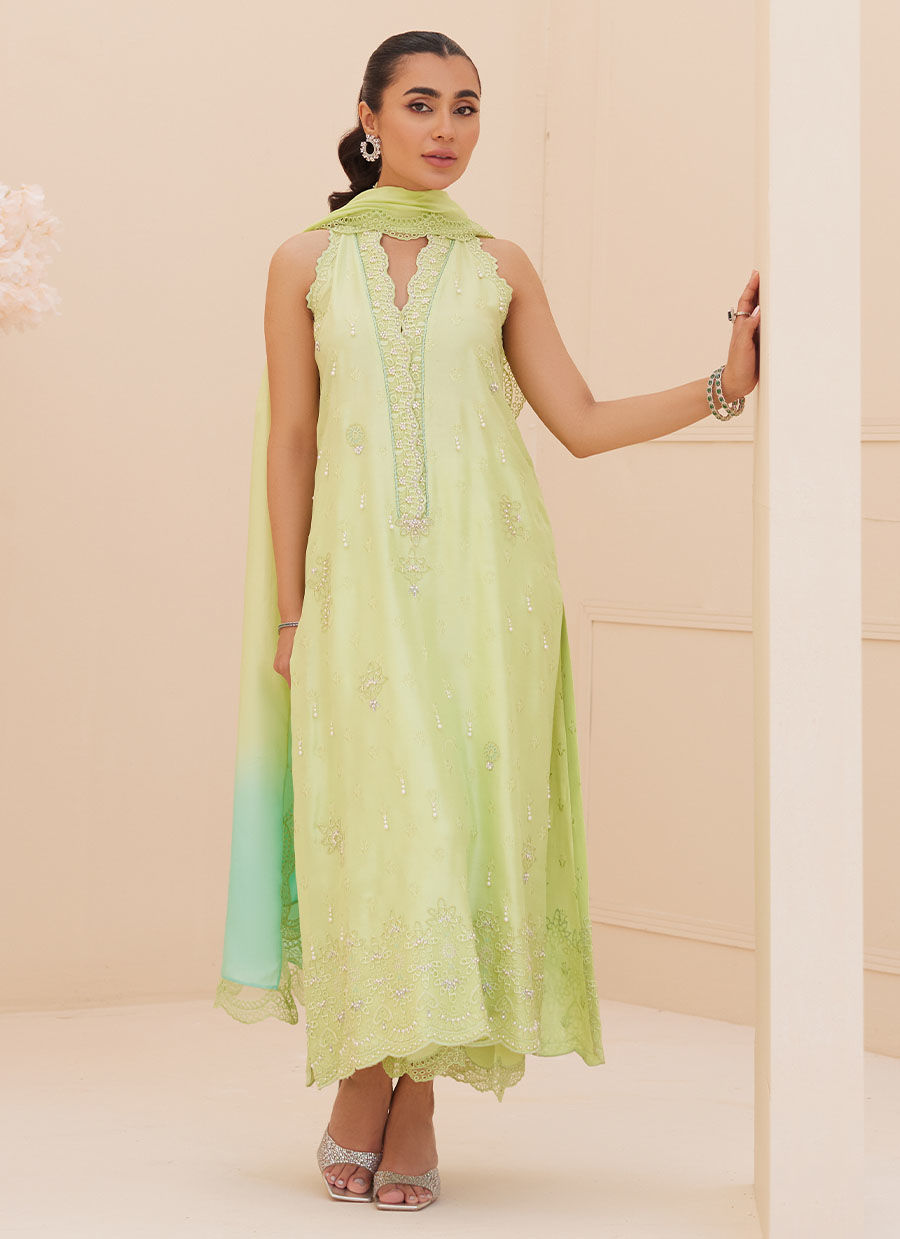 A captivating hue, with a myriad of signature FTA details, to make you stand out amongst the crowd. Cut from pure, breezy raw silk, this A line shirt is sure to become your forever favourite! A cool kiwi is richly embroidered with silk thread work and while the universally flattering neckline is adorned with an array of sparkling Swarovski crystals, pearls and sequins. Delicate embroidered motifs add the perfect amount of glamour.A pure medium silk, dip dyed dupatta with scalloped borders completes your ensemble with stunning grace. Pair yours with our coordinated, embroidered pants (as shown) and a sleek high pony tail for an unforgettable look!!