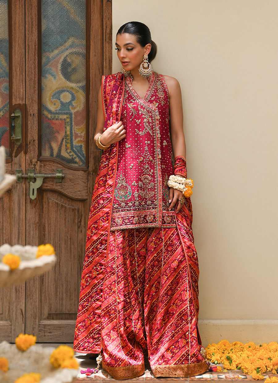 A true classic outfit and one of our favorites of the season! A stunning crimson shade contracts with shades of corals in a beautifully coordinated outfit perfect for festive occasions. It includes an alluring crimson raw silk short shirt crafted in an angrakha-cut style. The shirt is intricately hand embellished with kora, dabka, sitara, and appliques, showcasing exquisite craftsmanship. It is elegantly finished with a coral hand embellished border, adding a touch of sophistication. The shirt is paired with hand blocked coral Dhaka pants, which is adorned with sitara chann gota work, and a hand worked Banarsi border. The dhaka pants enhances the richness of the ensemble with its intricate detailing and vibrant color. Completing the ensemble is a coral hand blocked dupatta, embellished with sitara chann all over for a subtle shimmer. The dupatta is adorned with intricate handmade tassel finishing’s on the corners, adding a playful and festive touch to the outfit. This ensemble is a harmonious blend of traditional techniques and contemporary design, creating a look that is both elegant and festive, perfect for making a statement at any celebratory event.