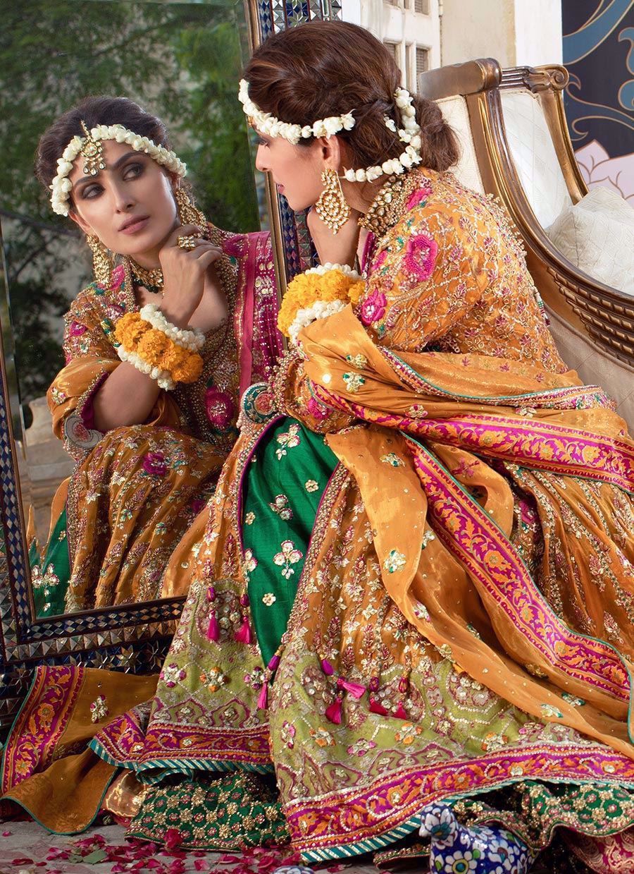 The most regal kalidaar in a beautifully festive traditional orange, embellished heavily with gota, zardozi and handmade florets. The intricate embroideries with traditional detailing of hanging tassels and edgings add to the wonderfully flared cut orange kalidaar in tissue material. It is complemented by an emerald green two tone kataan silk lehnga that is heavily embellished with gota booties and threadwork. Additionally the orange dupatta features colored borders embellished with gota and handwork.
