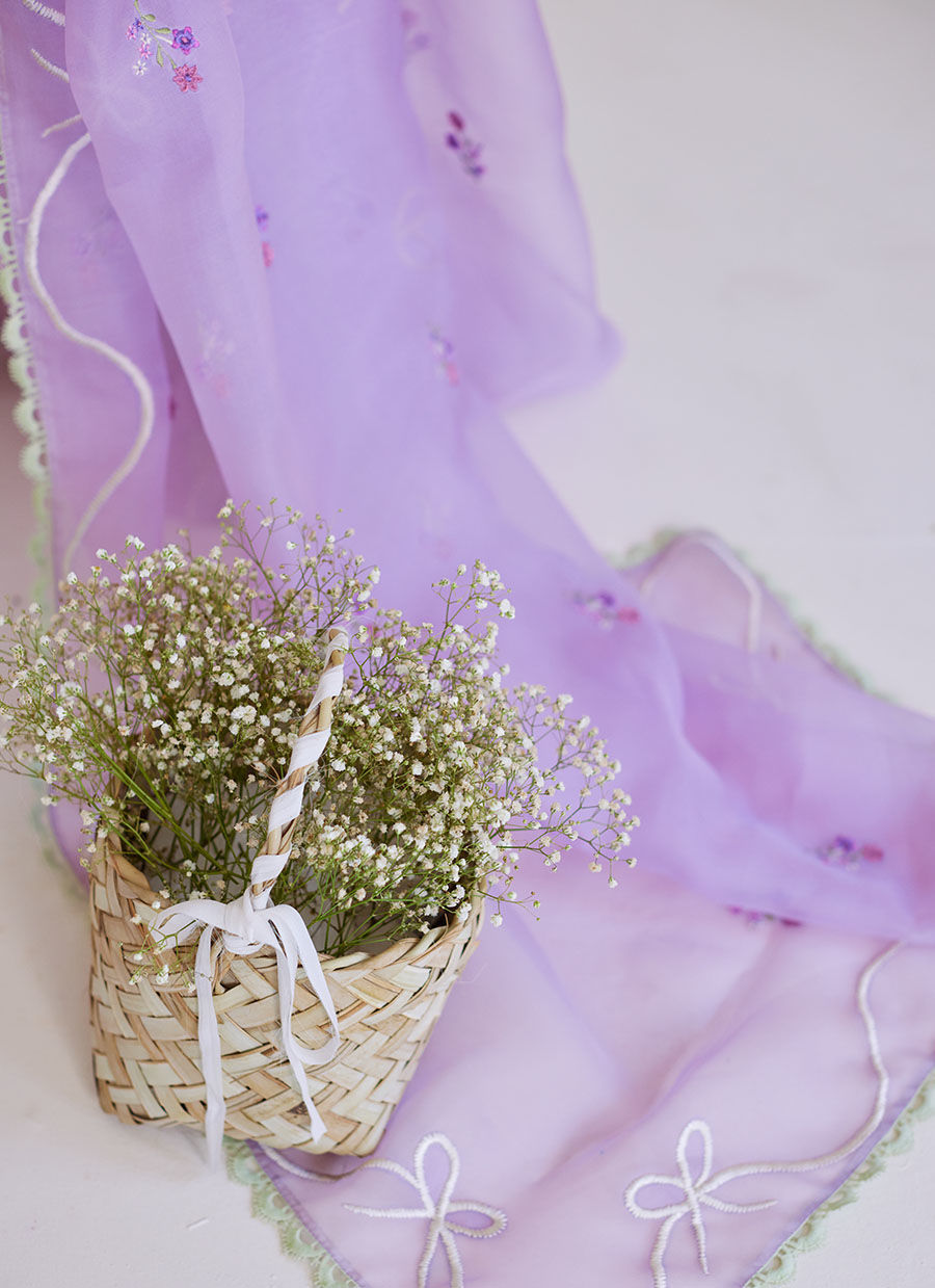Lilac organza dupatta adorned with embroidered summer blooms and a playful border featuring bows, adding a graceful flair to the ensemble.*Sleeves are added in all ready to ship items.