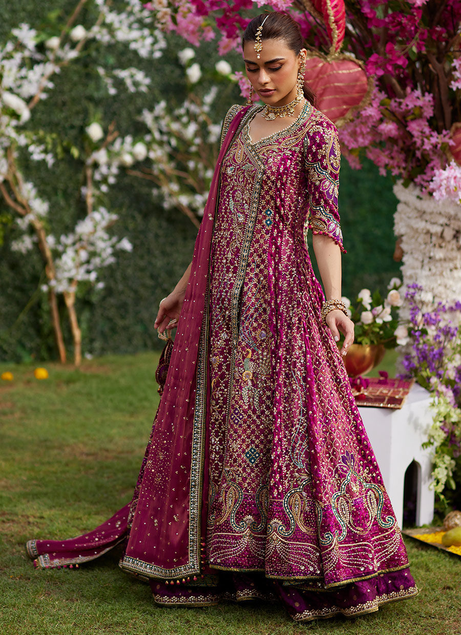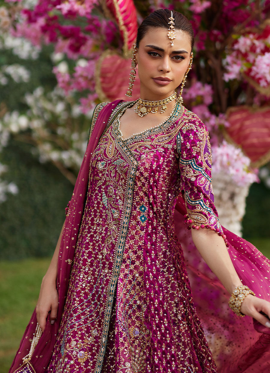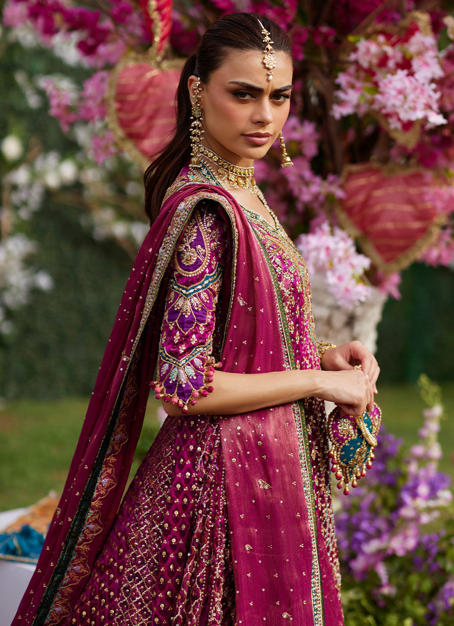 A kaleidoscope of jewel tones, with no shortage of bold details. A stunning kalidaar that we are absolutely obsessed with. The show stopping colour in a charmeuse silk, giving you the best fall as well as ample volume for that perfect twirl. The exclusively hand block printed fabric is adorned with an array of delicate hand embroidery all over. The shirt that we can’t get our eyes off, has unimaginable detailing from the ultra-flattering flared silhouette to the cut work back (that can be customized in a less revealing fashion). The sleeves with hanging tassels, intricate cutwork, hand crafted jewelled motifs make the outfit unforgettably unique. It is paired with a coordinating pink jamawar lehnga, intricately embellished to enhance the luxurious texture and complete the ensemble with graceful sophistication. A pink zarri tissue dupatta completes the look, embellished with delicate appliqué borders and refined detailing all around, adding lightness and shimmer to the outfit.