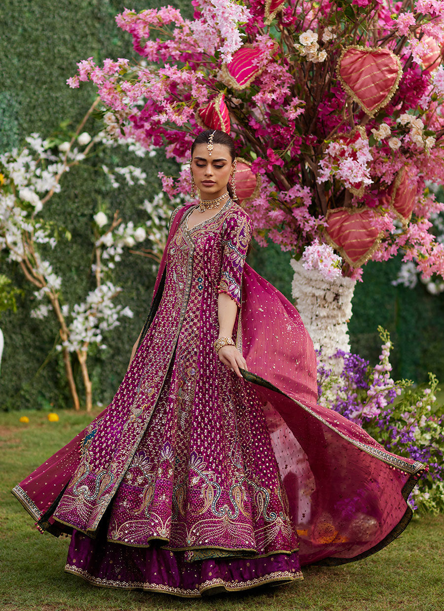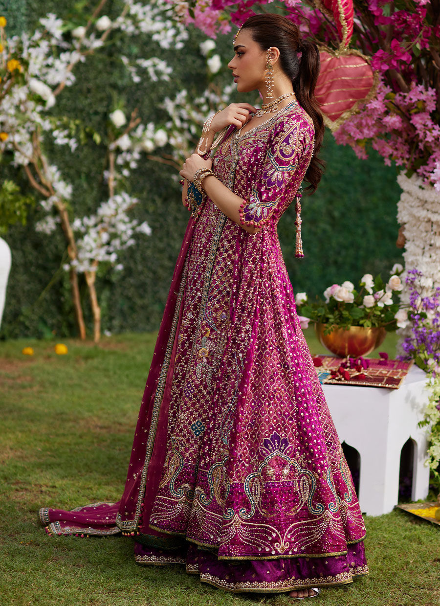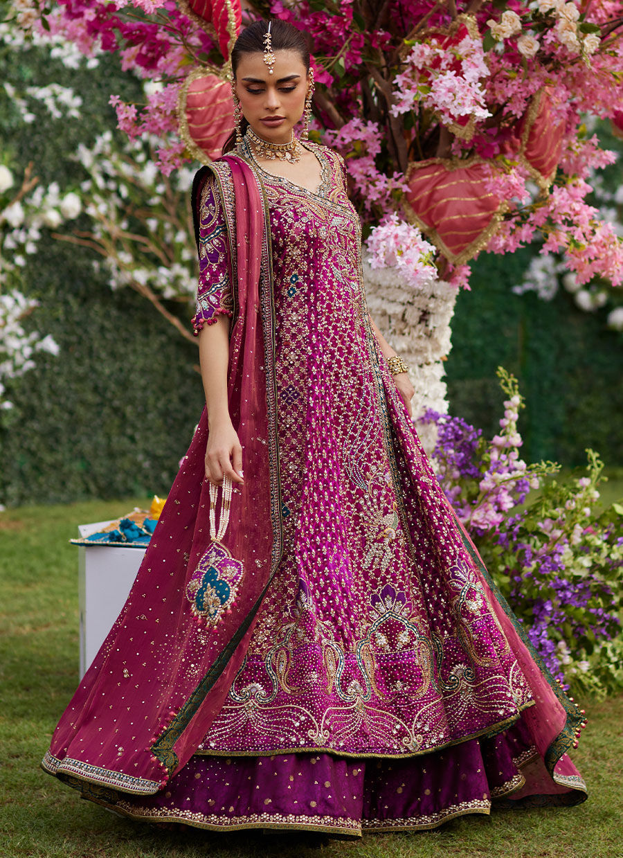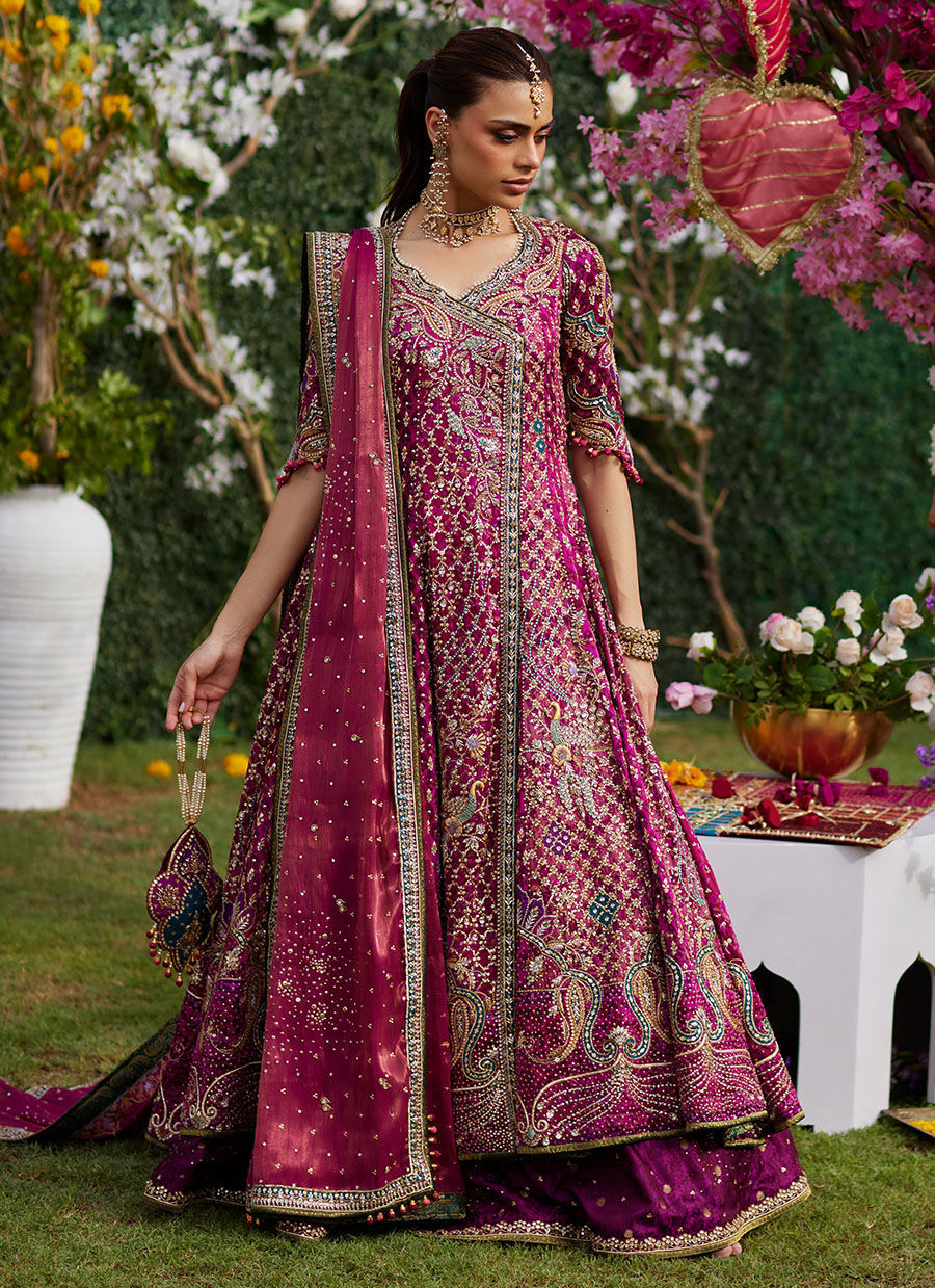 A kaleidoscope of jewel tones, with no shortage of bold details. A stunning kalidaar that we are absolutely obsessed with. The show stopping colour in a charmeuse silk, giving you the best fall as well as ample volume for that perfect twirl. The exclusively hand block printed fabric is adorned with an array of delicate hand embroidery all over. The shirt that we can’t get our eyes off, has unimaginable detailing from the ultra-flattering flared silhouette to the cut work back (that can be customized in a less revealing fashion). The sleeves with hanging tassels, intricate cutwork, hand crafted jewelled motifs make the outfit unforgettably unique. It is paired with a coordinating pink jamawar lehnga, intricately embellished to enhance the luxurious texture and complete the ensemble with graceful sophistication. A pink zarri tissue dupatta completes the look, embellished with delicate appliqué borders and refined detailing all around, adding lightness and shimmer to the outfit.
