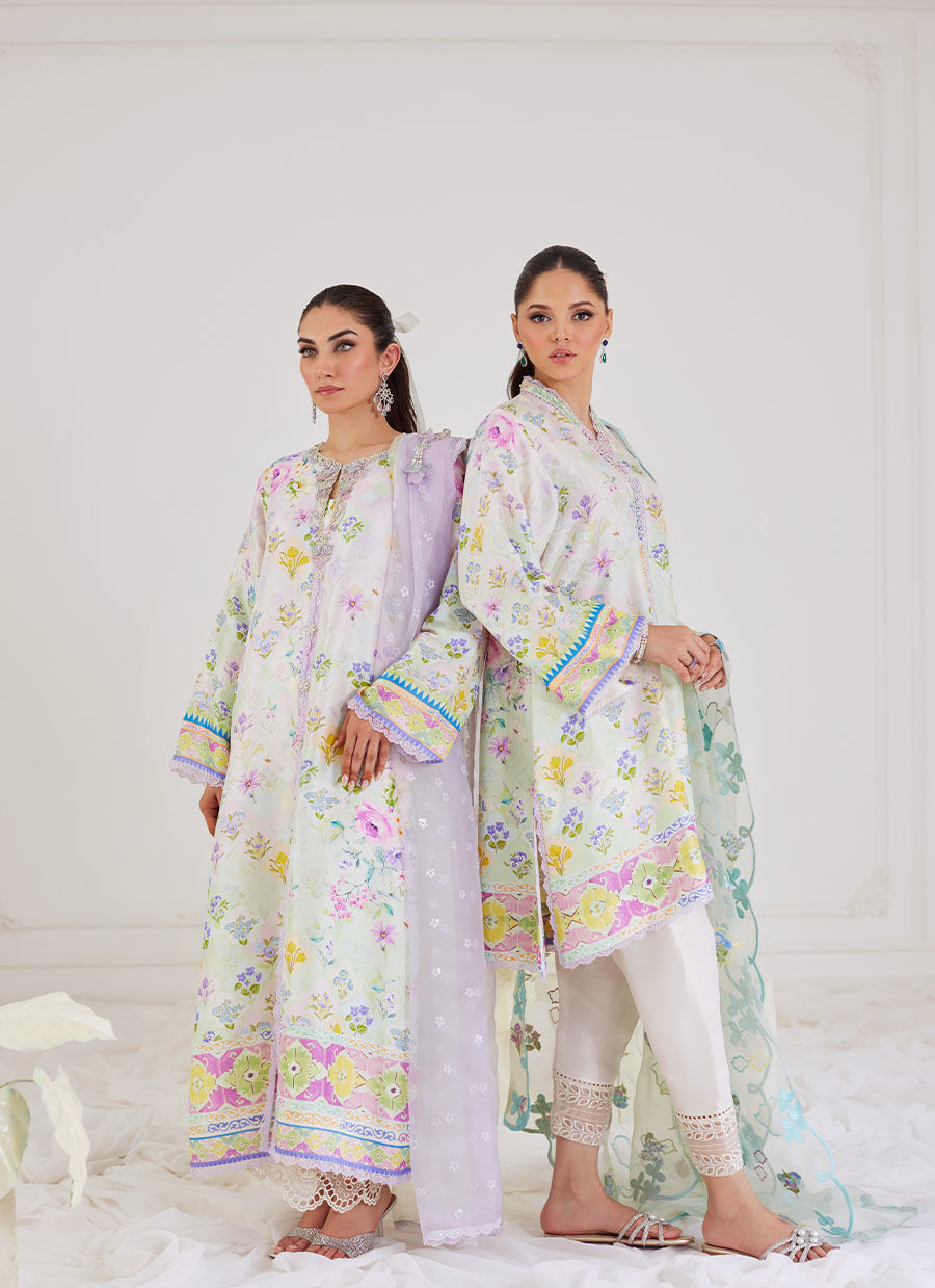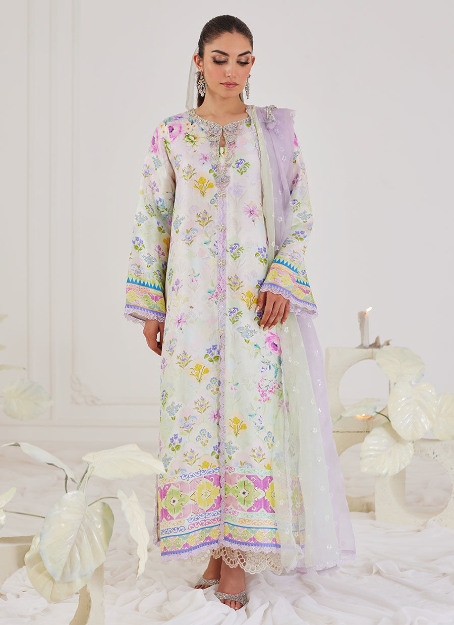 A contemporary uber-flattering silhouette, with the ultimate cool girl details to have your heart swooning. An utterly captivating outfit with, a gorgeous hand embroidered organza neckline and sleeve cuffs. A pre-draped organza dupatta cinched at the shoulder with a handmade pearl tassel, makes this an absolute must have!