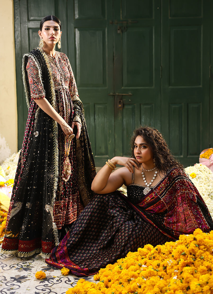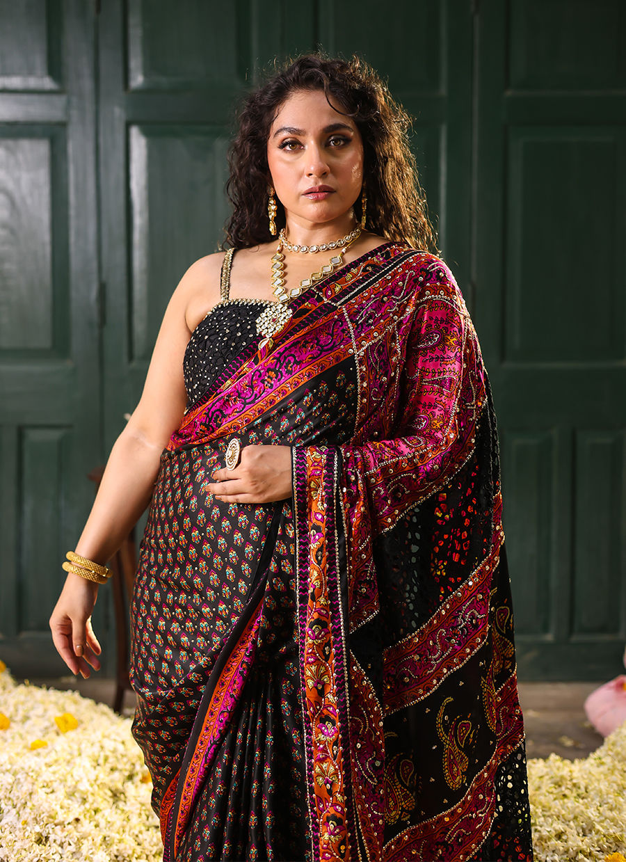 A Stunning charmeuse hand blocked black sari showcases a striking blend of shades with vibrant pink and orange accents. The pallu is the highlight, beautifully adorned with intricate cutwork and exquisite handwork details that include kora, dabka, and Swarovski stones, creating a mesmerizing and luxurious effect. Paired with the sari is a sleek black blouse featuring embellished straps, adding a contemporary touch to the traditional ensemble. The embellished straps on the blouse perfectly complement the detailed pallu, creating a cohesive and sophisticated look. This ensemble is perfect for evening events and special occasions, where the blend of vibrant colors, intricate handwork, and modern elements come together to create a stunning and unforgettable outfit.