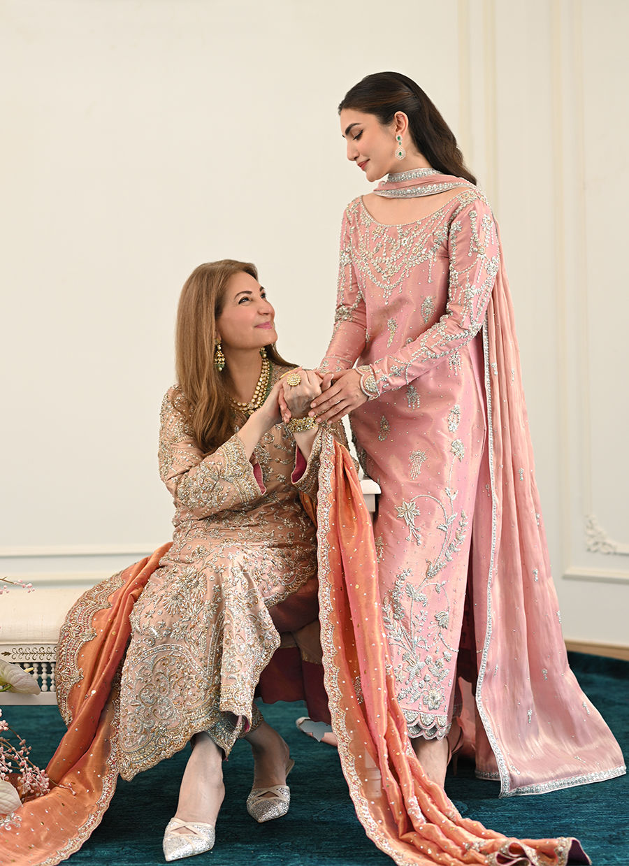 A touch of youthful charm unfolds in the form of light pink thread work that weaves its way throughout the kameez. This captivating interplay of colour creates a symphony of light and whimsy. Completing the Saiba masterpiece is a soft tissue dupatta, delicately adorned with gold zari work. Flowing effortlessly, it echoes the grace of the ensemble. The zari silk trousers, seamlessly harmonious with the kameez, create a vision of effortless elegance.