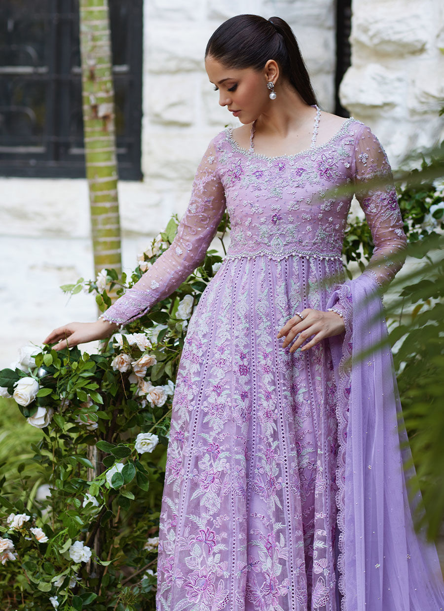Beautifully crafted from a remarkably glamourous shade of lavender organza, the ensemble strikes the perfect balance between elegant and eye-catching. This flowing kalidaar is richly embroidered with intricate, silk threadwork, while the bodice is further uplifted with silver and pearl hand embellishment and little pops of pale pink blooms. The cascading panels flow gracefully bringing irresistible movement to the ensemble. The kalidaar is paired with a delicate tulle dupatta in coordinating lavender trimmed with embroidered borders to give the outfit a stunning flair.