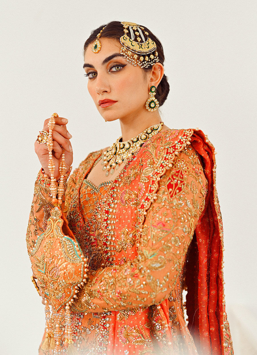 Sitara's magic lies in the intricate details. Panels of gold zari fabric are adorned with shimmering embroidery and dabka work. A vibrant red farshi border adds a touch of heritage to this celestial masterpiece. Sitara is truly a timeless expression of beauty. Let the warmth of coral embrace you and the embellishments illuminate your path.