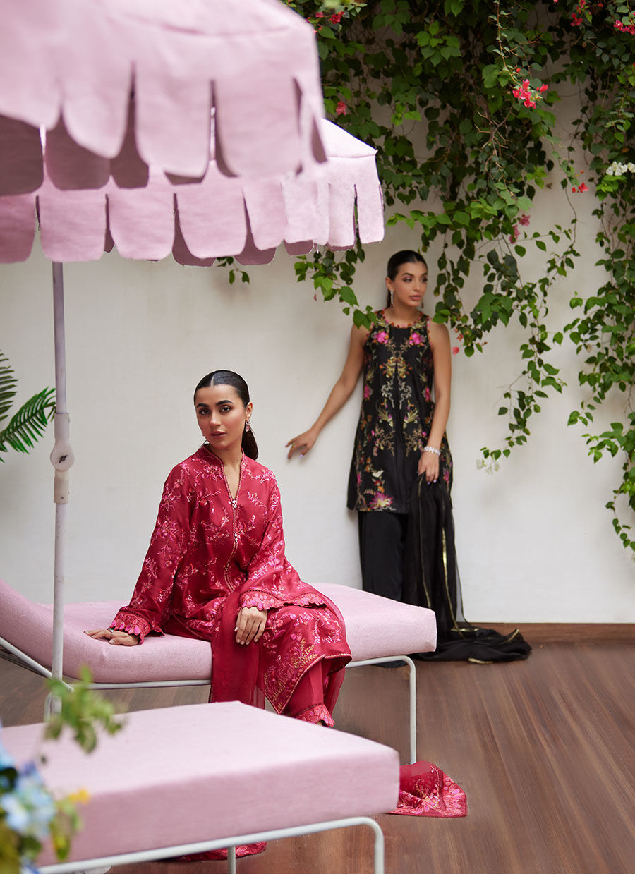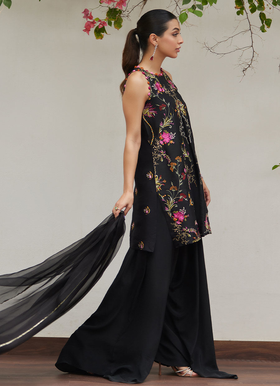 This effortlessly chic and classy black silhouette will declare you the best dressed wherever you go. Absolutely fitting for the spring season, the pure raw silk short shirt features a round neckline that sits close to the neck with a flattering incut armholes and side slits. It is decorated with vibrant embroidered botanical motifs all over the shirt that bring a kaleidoscope of uplifting floral hues. Paired with loose voluminous flared pants that accentuate the length of this fit and an organza dupatta with embroidered lace finishing, this look will steal the moment this season and every season that follows.