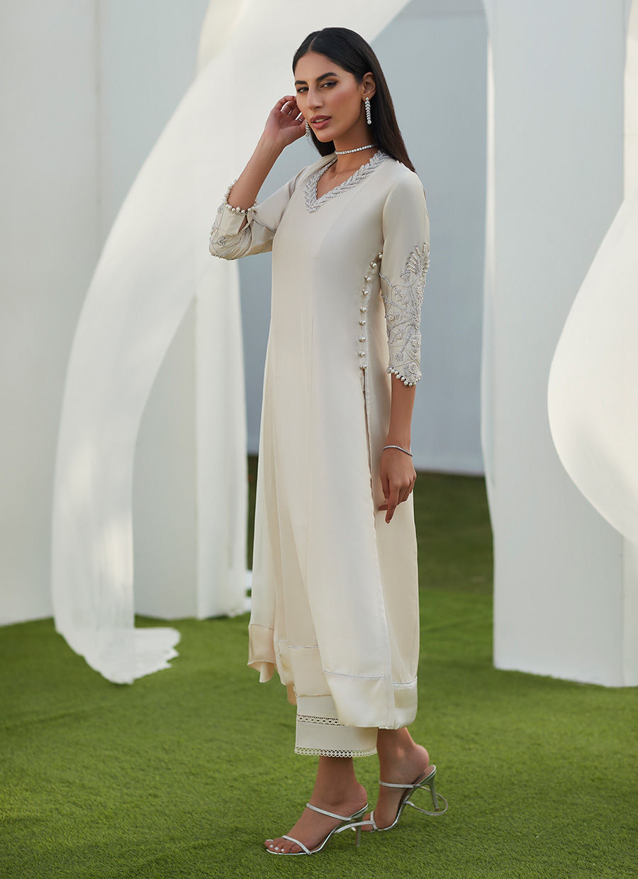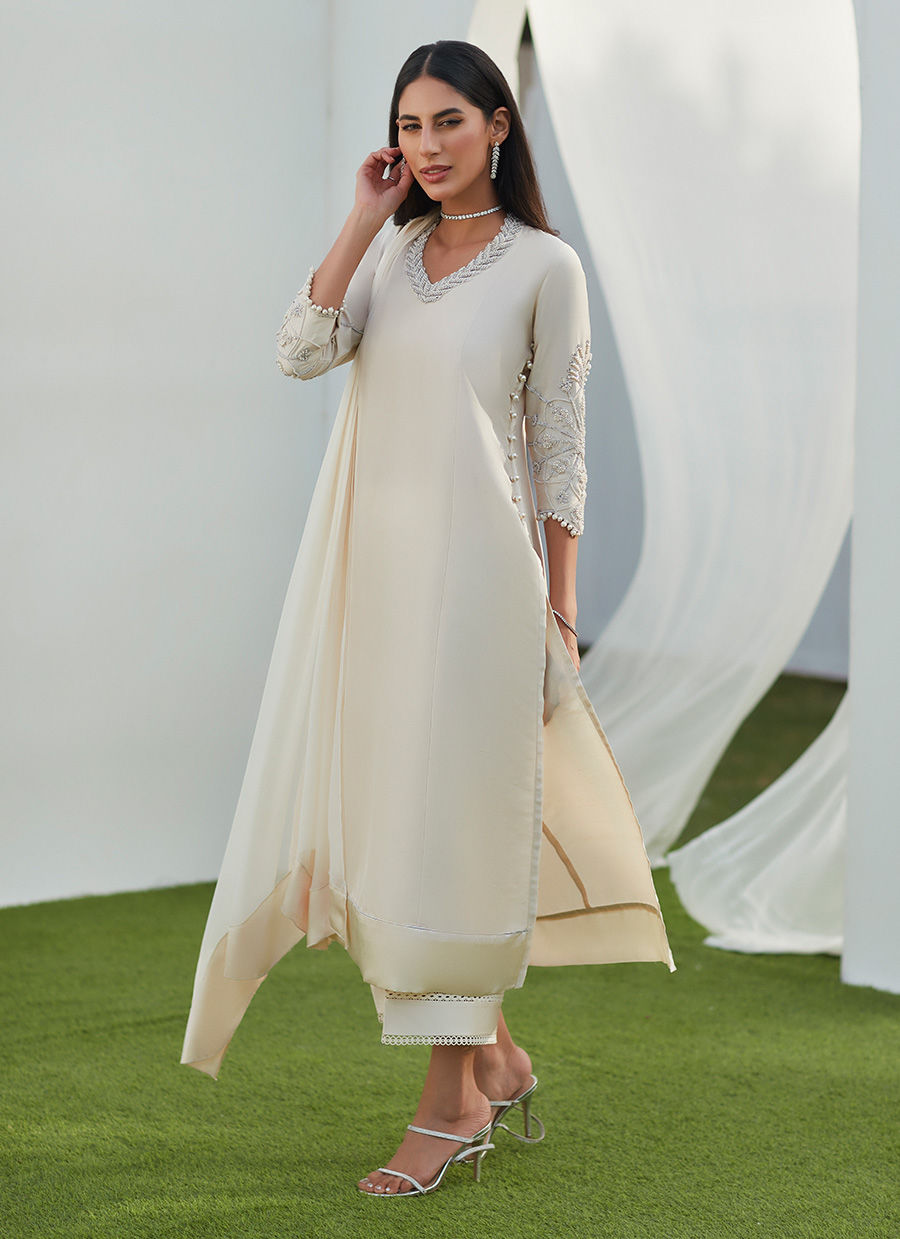 Get ready to be the center of attention with a captivating, romantic ensemble featuring an abundance of signature FTA details. Cut from pure silk, this gorgeous ensemble, in pristine ivory, is going to be your perfect solution for all special occasions.