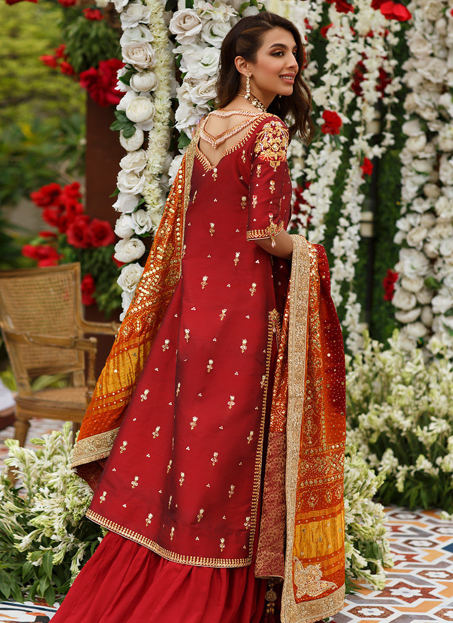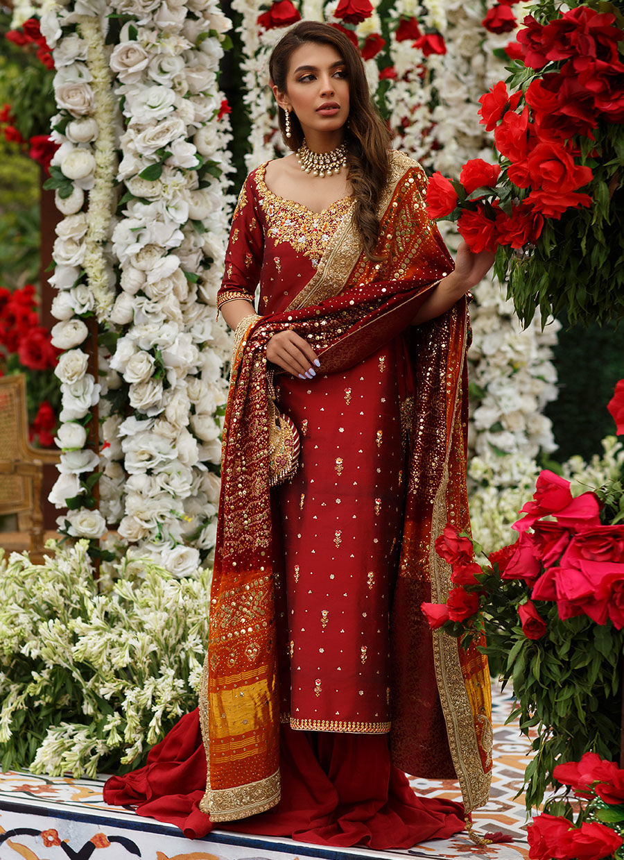 The Surkh-Zar, a deep red, romantic ensemble. Cut from pure exclusively woven katan silk, with an intricately hand embellished neckline and sleeves. Delicate booties and sequins adorn the shirt along with a delicate border on the daaman and sleeves. The piece de resistance is the stunning back, with a gorgeously detailed neckline, sure to turn heads everywhere.
