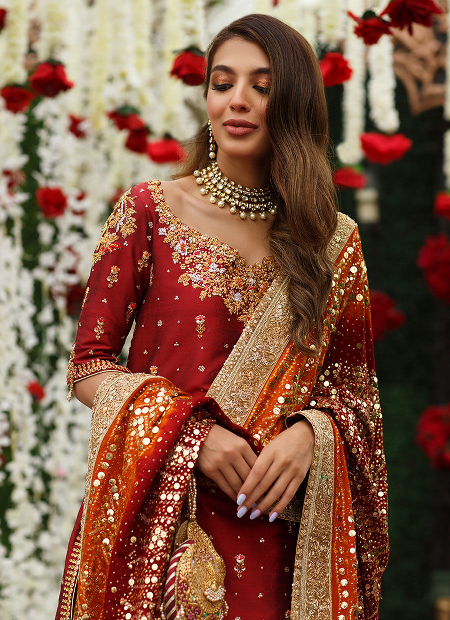 The irresistible combination of striking red and gold with the occasional touch of silver is sure to make you stand apart from the crowd with effortless style. Our master artisans spend inordinate amount of time, painstakingly translating our drawings on paper to the kora, dabka and sequin hand work that makes this ensemble an absolute must-have.