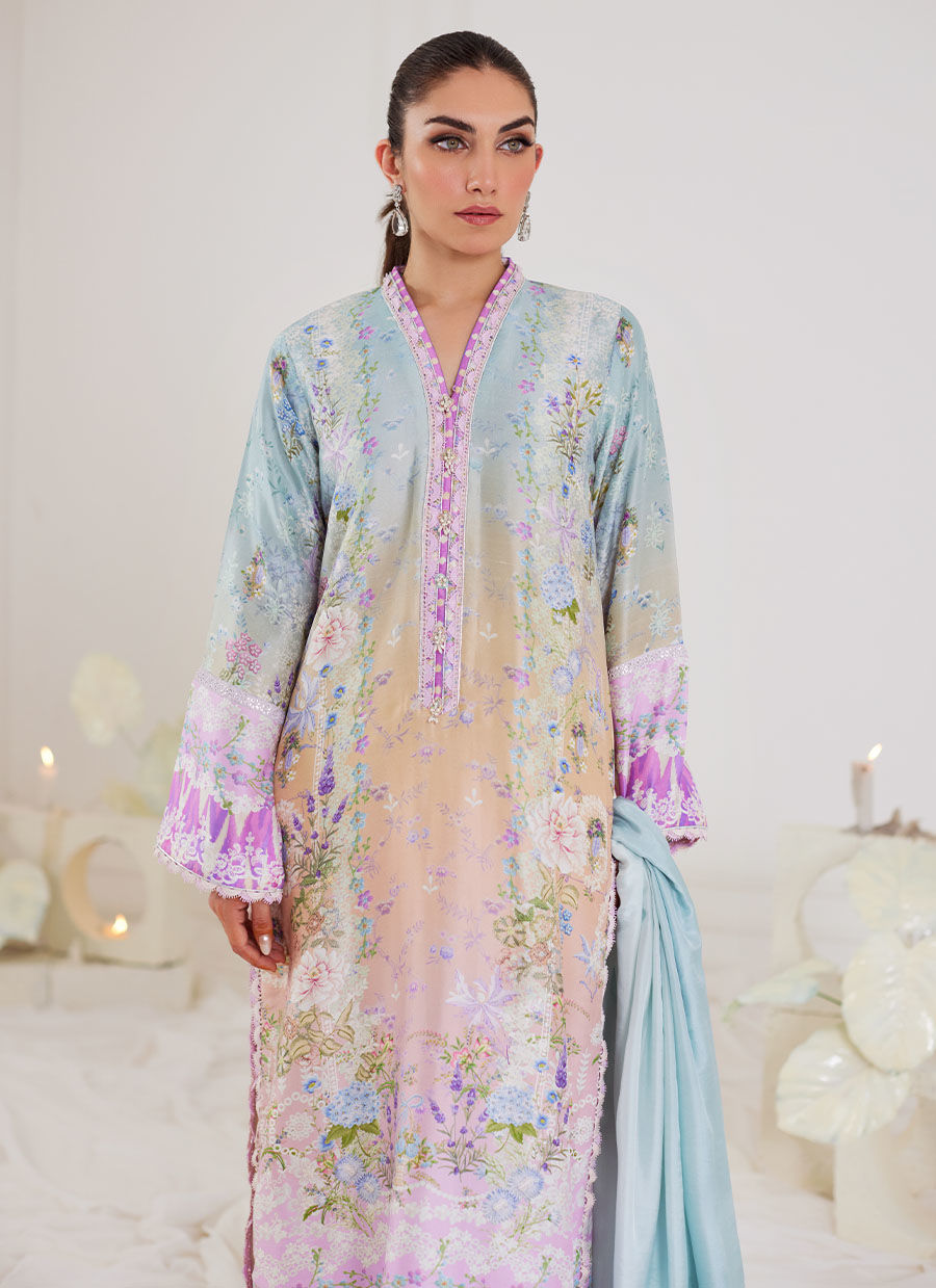 Infused with the signature FTA aesthetic, our new prints have the perfect pastel hues to make your heart skip a beat!! Cut from sumptuous raw silk, the shirt is given a striking ombre treatment, with a gorgeous ice blue that flows seamlessly into an irresistible peachy tone and then lavender. Whimsical florals bloom daintily all over the shirt, making this an absolute must have. The relaxed, much loved silhouette has a universally flattering neckline, adorned with delicate hand-made floral motifs, pearls and sequins, add an easy timeless elegance. A coordinating pure medium silk dupatta, in ice blue brings the look together with graceful flair. Pair yours with our embroidered cutwork pants as shown.
