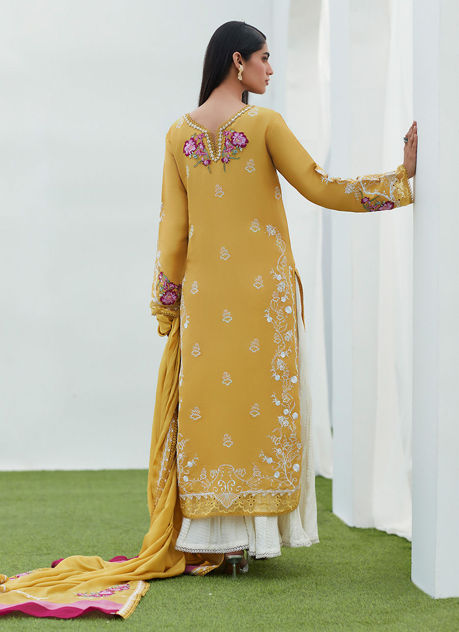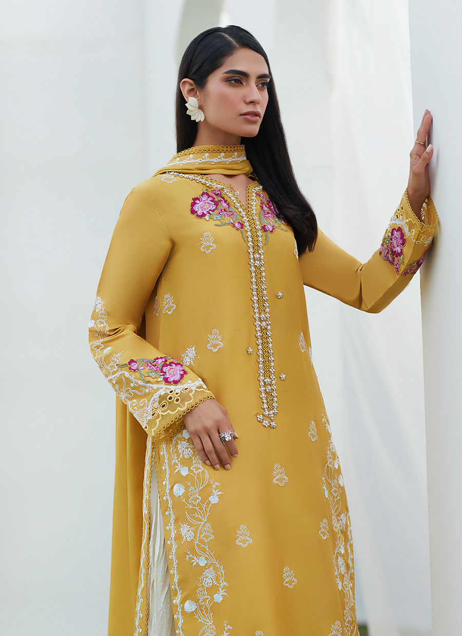 Complete your ensemble with the luscious, flowing, pure medium silk, dupatta with embroidered floral motifs on all four corners. Complete your ensemble with pure silk crushed pants for an unforgettable look!