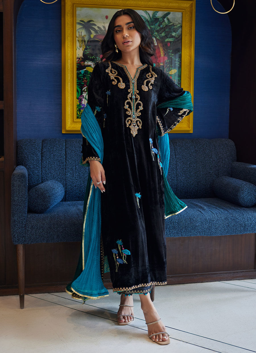A gorgeous, deep onyx kurta cut from plush velvet with a round with ‘V’ neckline intricately hand embellished with kora and dabka in regal gold.