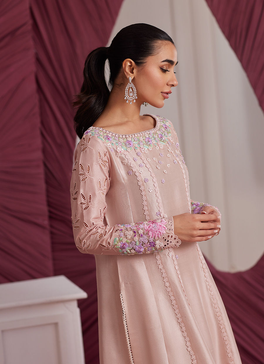 This stunning peachy-pink raw silk kalidar is a perfect blend of elegance and intricate craftsmanship. The outfit features a beautifully hand worked neckline, adorned with fine details that add an air of sophistication. The flowing kalidaar is further elevated by the embroidered organza border, which enhances its delicate beauty. The raw silk cut work sleeves are a standout feature, showcasing intricate hand worked floral embroidery that adds depth and texture to the design. Paired with the outfit is a soft pink chiffon dupatta, which drapes gracefully and complements the ensemble’s gentle tones. Completing the look is a solid peachy-pink raw silk izaar, offering both style and comfort. This ensemble is a refined choice, exuding timeless charm with its rich fabric, detailed craftsmanship, and harmonious color palette, making it perfect for special occasions.