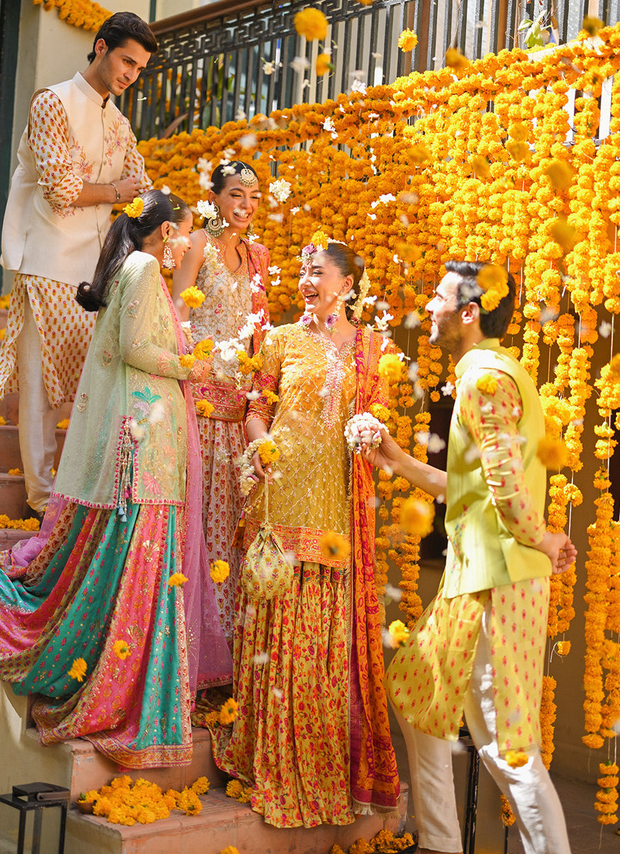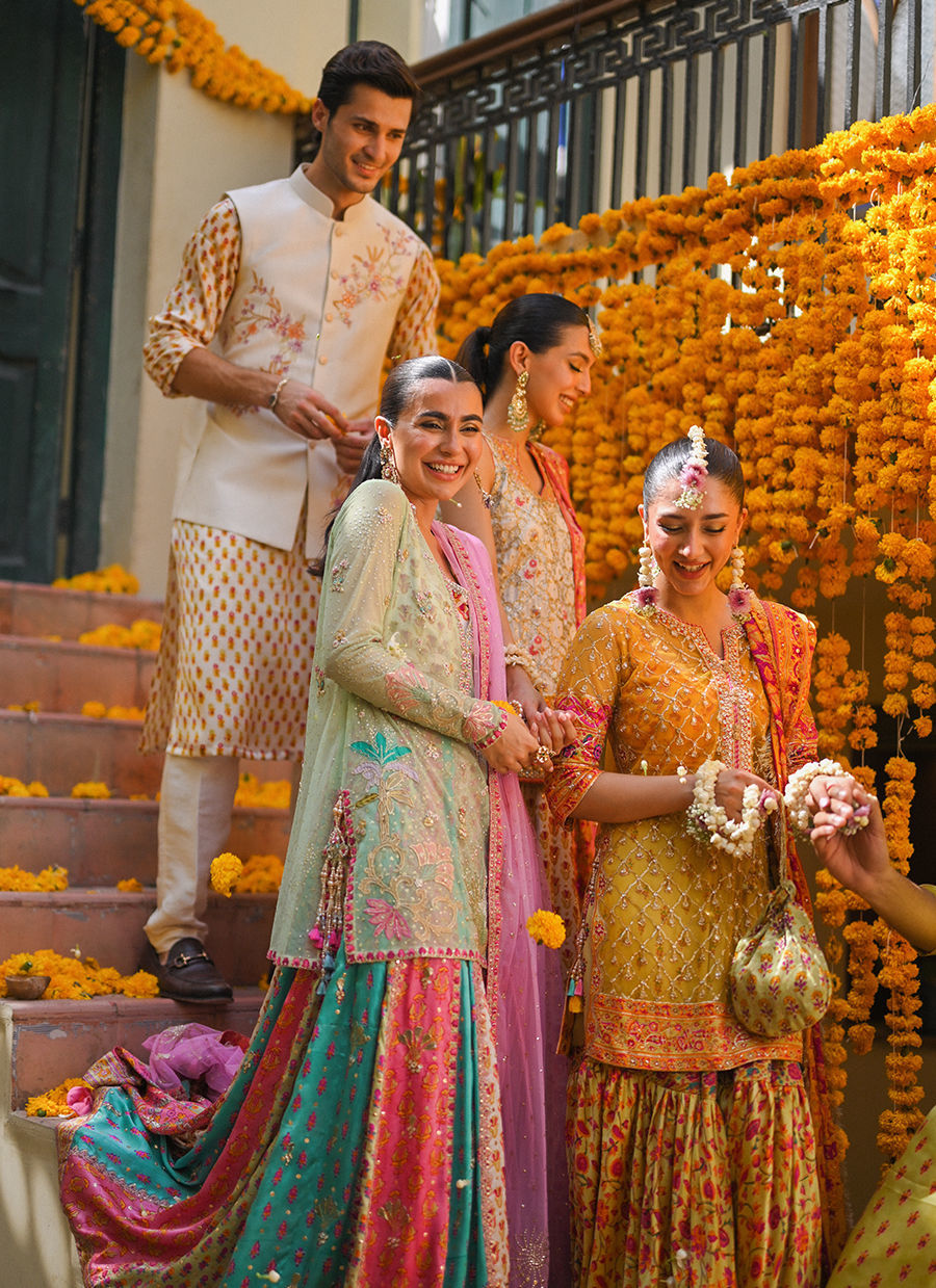 Farah Talib Aziz’s foray into menswear results in a sleek, pared down approach to the traditional festive ensemble for men an ivory hand blocked kurta that exudes a sense of timeless elegance and sophistication. The delicate hand blocking on the kurta adds an element of traditional craftsmanship, enhancing its overall charm and subtlety. The combination of the serene ivory kurta with the richly decorated raw silk waistcoat creates a balanced and refined look. This ensemble seamlessly blends traditional elements with contemporary style, ensuring that the wearer stands out with grace and sophistication.
