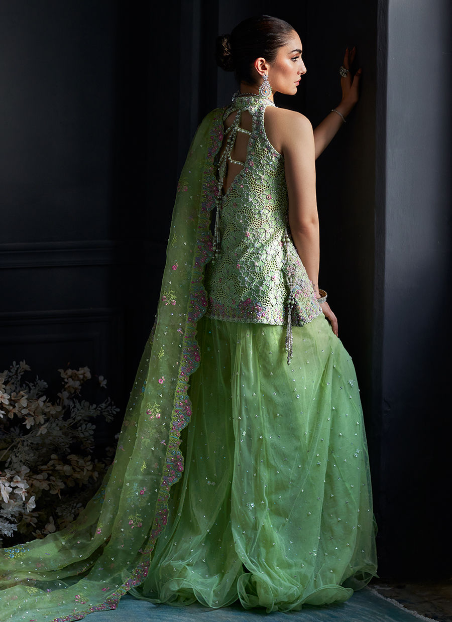 Color: Kiwi Green Fabric: Lehenga: Pure Tulle Dupatta: Pure Organza Work Details: Embroidered and Embellished