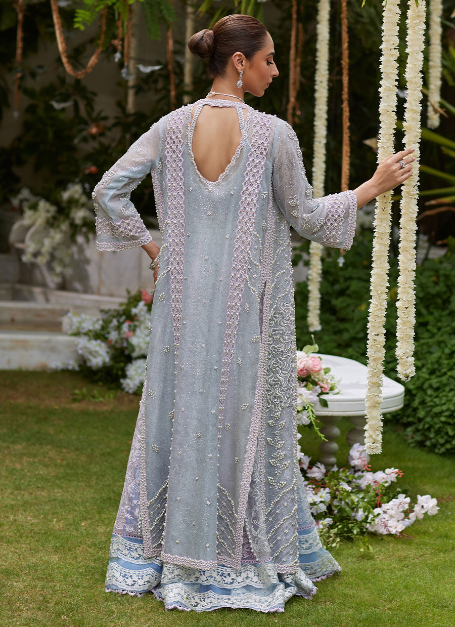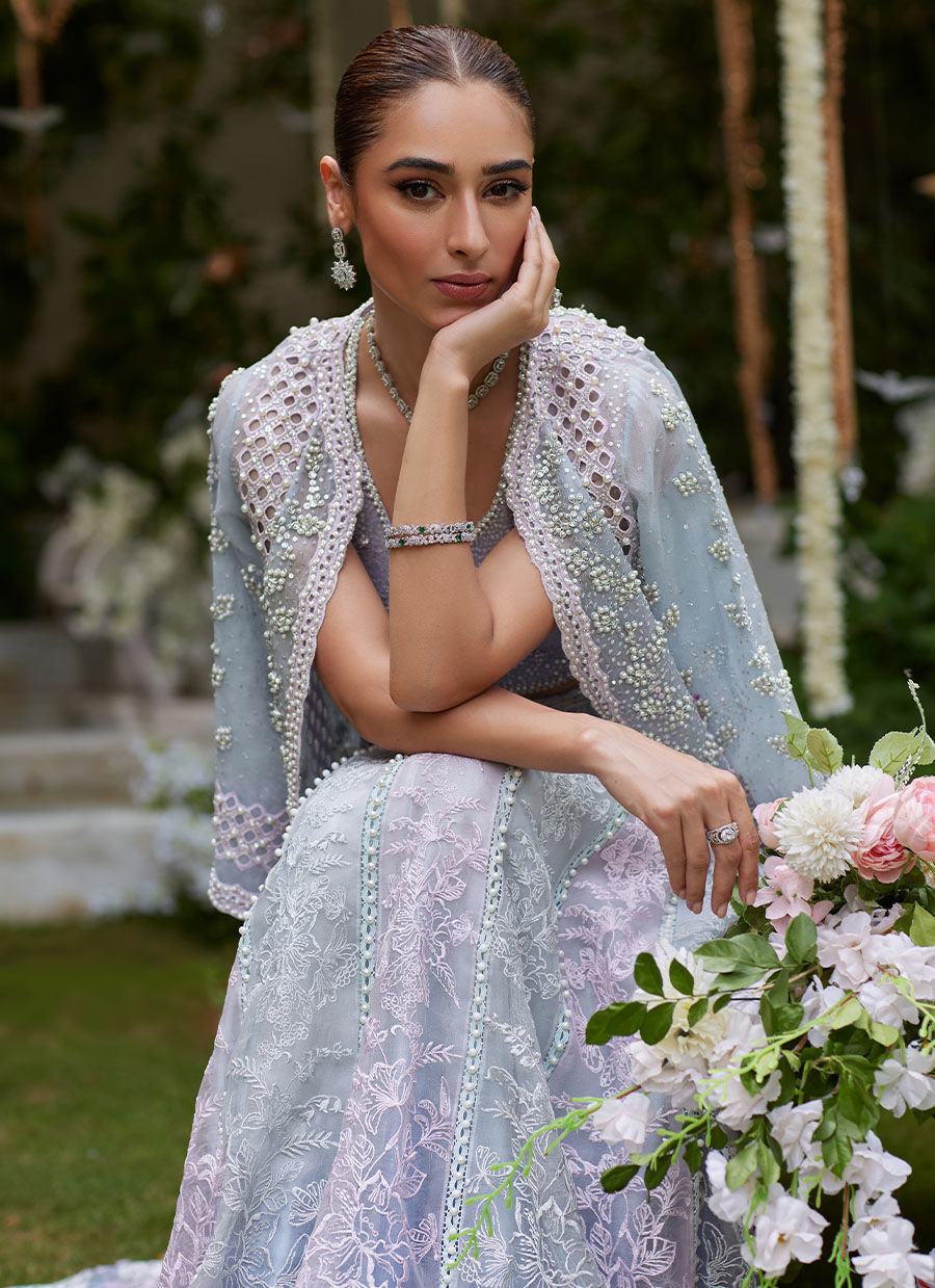 Beautifully crafted from a remarkably glamourous pastel shade of net, the Zephra ensemble strikes the perfect balance between elegant and eye-catching. The flowing front open jacket and lehenga is richly embroidered with intricate, silk threadwork, while the bodice is further uplifted with silver and pearl hand embellishments and little pops of pale pink blooms. The cascading panels of the lehenga flow gracefully bringing irresistible movement to the ensemble. The jacket is panelled with hand worked schiffli and net panel with pearl embellishments. Style yours with strappy heels and a statement choker for a timeless, gorgeous look.